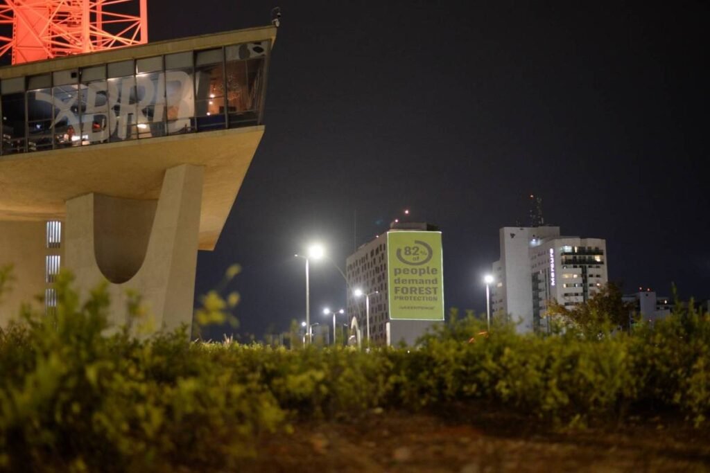 Durante o jantar de alguns dos principais negociadores e diplomatas da COP30, a conferência de clima da ONU (Organização das Nações Unidas), a ONG Greenpeace fez uma série de projeções para cobrar medidas para zerar o desmatamento florestal, no início da noite deste domingo (12).